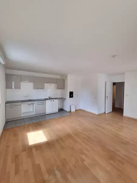 Superbe et grand appartement de 3 pièces bien configuré avec un balcon, situé au premier étage d'un immeuble de 2013 avec ascenseur et digicodes, comprenant : une grande entrée, un vaste séjour avec un coin cuisine de 26.7m², un dégagement, 2 chambres dont une grande chambre de 12.8 m², une salle de bains spacieuse, et un WC séparé.