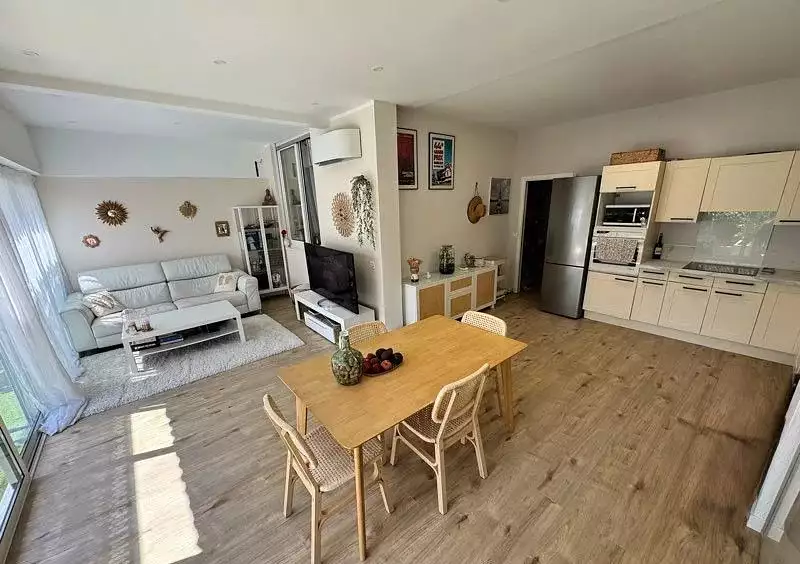 Un grand salon avec cuisine ouverte de 36,5 m² donnant sur une belle terrasse. Deux chambres dont une parentale d’environ 12 m², une chambre d’enfant ou bureau de 8 m². Une salle de bain de 3,6 m² (propre peut-être à moderniser), un beau jardin sécurisé de 60 m² avec citronnier, olivier, avec son jacuzzi. Climatisation réversible, double vitrage.