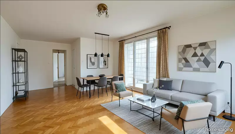 - Séjour parqueté spacieux de 25,4 m², lumineux, avec accès à une loggia de 7,5 m²