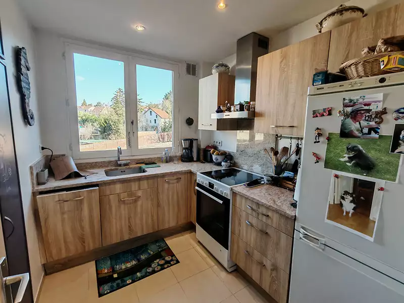 Dans résidence arborée, appartement de 4 pièces principales au 1er étage, comprenant : entrée, cuisine, séjour double, deux chambres, salle d'eau, wc, balcon.