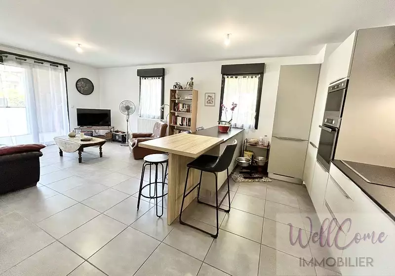 À Aix-les-Bains, secteur Saint-Simond à seulement 5 minutes en voiture du centre-ville Appartement 3 pièces moderne de 65,69 m² habitables situé au 1er étage dune petite résidence moderne de 2019 avec ascenseur. Le logement se compose dune entrée avec placard, un séjour avec cuisine équipée donnant sur une terrasse abritée de 8,80 m² exposée ouest, idéale pour profiter des beaux jours ! La partie nuit comprend 2 chambres avec placards (exposées Est), une salle de bains, ainsi quun WC indépendant. Lappartement est vendu avec une place de parking extérieure et une cave. En option, vous pouvez également acquérir un garage de 16 m² au sous-sol de la résidence (valeur : 20 000 ). Côté confort, le logement dispose dune chaudière individuelle au gaz pour la production du chauffage et leau chaude ainsi que de huisseries métalliques en double vitrage oscillo-battant avec volets roulants électriques. Les charges de copropriété couvrent lentretien général de la résidence. Contactez-nous dès maintenant pour organiser une visite de cet appartement moderne et agréable à vivre ! Bien soumis au statut juridique de la Copropriété. Nb de lots : 53. Charges annuelles de copropriété (Montant moyen annuel quote-part du budget prévisionnel vendeur) : 924,64 euros Pas de procédure en cours. Honoraires TTC charge vendeur.