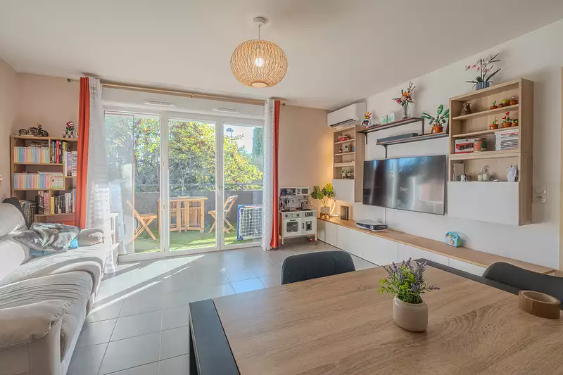 Le séjour donne sur une terrasse d'environ 10 m2.