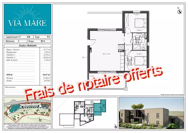FRAIS DE NOTAIRE OFFERTS !!! J'ai le plaisir de vous présenter ce magnifique appartement (N°118) d'une surface d'environ 64.67m2, dans cette résidence nommée "VIA MARE", de belle architecture entre tradition et modernité, qui sera implantée sur une parcelle route de la Mer à Ghisonaccia.