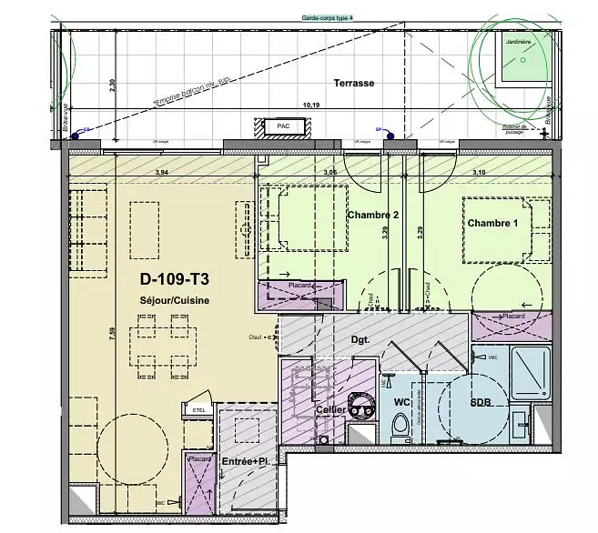On vous présente un appartement type T3 neuf composé d'un séjour avec cuisine ouverte, deux chambres avec placards, un cellier, une entrée avec placard, un wc indépendant et une salle d'eau.
