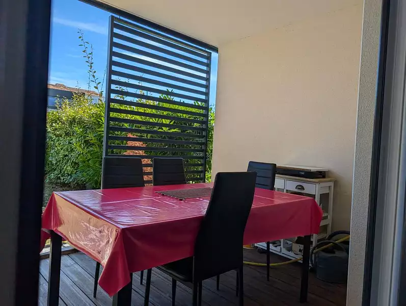 Dans une Résidence Récente sécurisée, Très agréable Trois Pièces fonctionnel composé d'une entrée dotée d'un placard, Pièce de Vie (Séjour-Cuisine aménagée/équipée) avec un accès direct sur la terrasse et sur un joli jardin privatif (80m² env.), deux chambres, salle d'eau, wc.