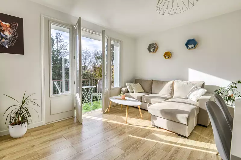 • Une pièce de vie lumineuse, exposée plein Sud, s'ouvrant sur un balcon offrant une vue dégagée sur le parc privé arboré de la résidence.