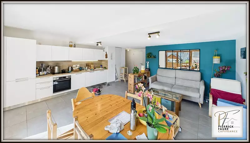 La pièce de vie de 28 m² baignée de lumière s'ouvre sur une grande terrasse plein sud d'environ 15 m².