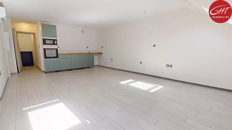 D'une surface de 66 m2 loi Carrez (supérieur à 1m80) et 77 m2 au sol, il se compose : d'une entrée, une grande pièce de vie de 28 m2 (32 m2 au sol) ouverte sur la cuisine, trois chambres, une salle d’eau et des toilettes séparées.