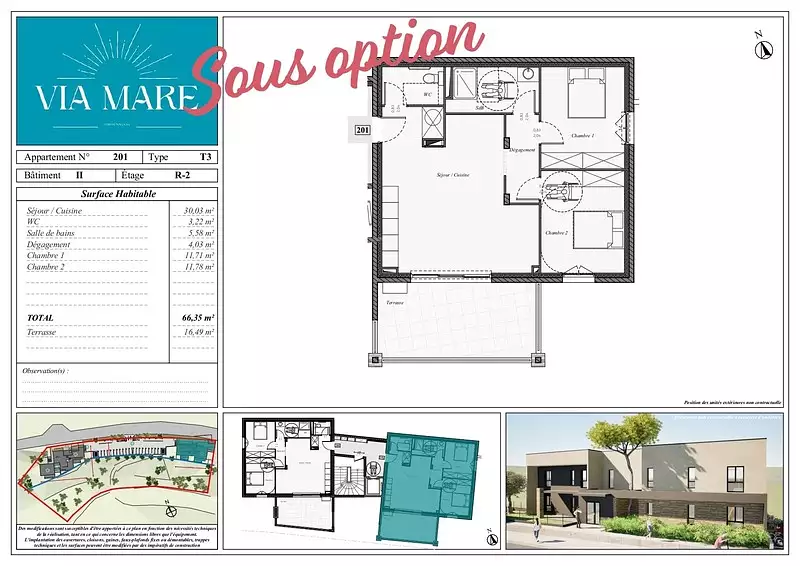 L'appartement situé au BATIMENT Ii, à l'étage R-2, d'une surface d'environ 66.35m2, se compose ainsi (voir plan des surfaces):
