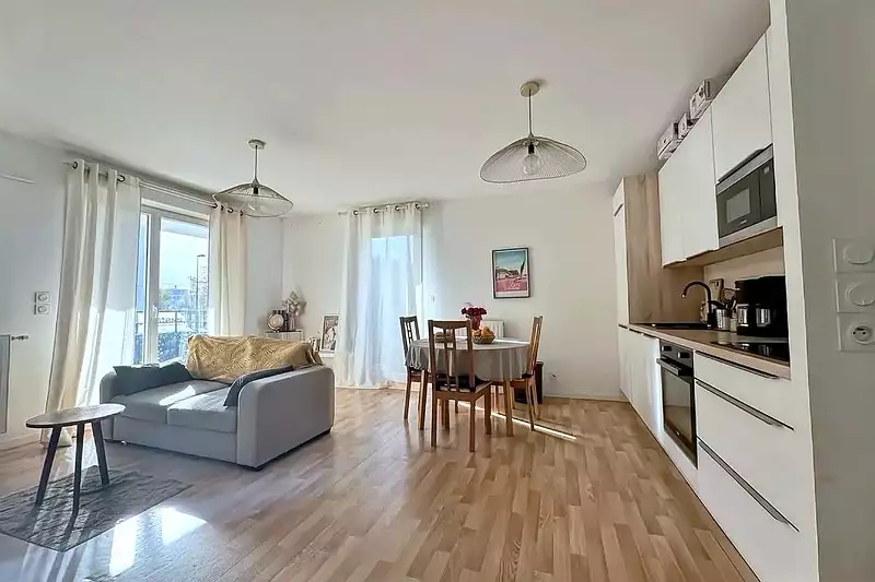 A VENDRE NANTES DURANTIERE - Venez poser vos valises dans cet appartement lumineux, idéalement situé au pied du tramway Ligne 1, dans une résidence récente livrée en 2019. Il offre une belle pièce de vie avec cuisine équipée, ouvrant sur une terrasse exposée sud. Une seconde terrasse dessert les deux chambres, apportant luminosité et un agréable espace pour profiter de l'extérieur. Vous trouverez également une belle salle de bains et un WC séparé. Garage boxé inclus. Un appartement agréable à vivre, proche des commerces, des écoles et des espaces verts. A visiter sans tarder. (5.28 % honoraires TTC à la charge de l'acquéreur.) Copropriété de 53 lots (Pas de procédure en cours). Charges annuelles : 90 euros. Louis GALMICHE (EI) Agent Commercial - Numéro RSAC : - .