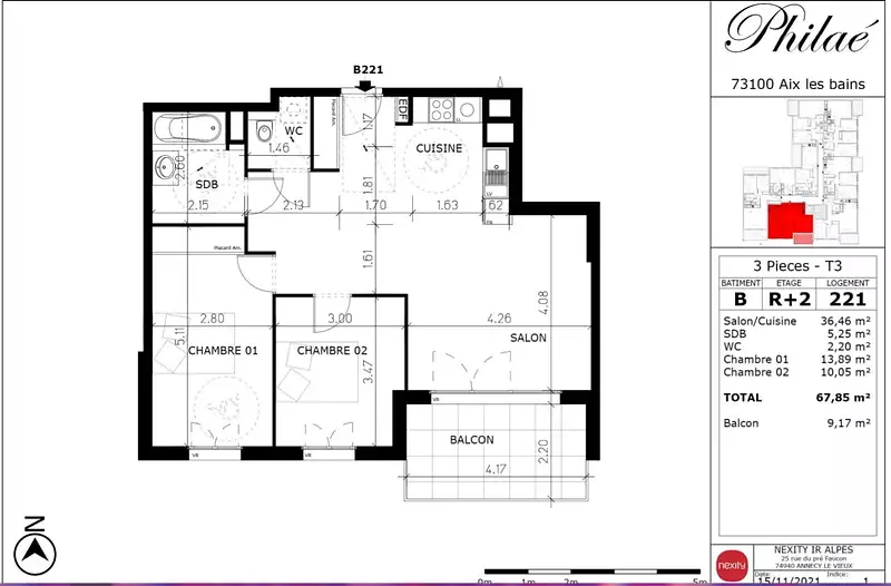 | 67,85 m² - 3 pièces - 2 chambres | Dernier étage (2ème) avec ascenseur |