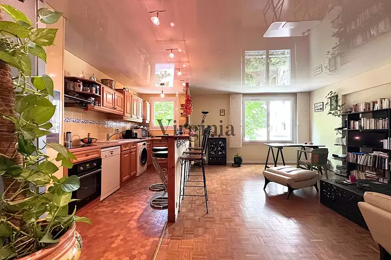 Grande pièce de vie de 35 m² avec séjour lumineux et cuisine ouverte, aménagée et équipée