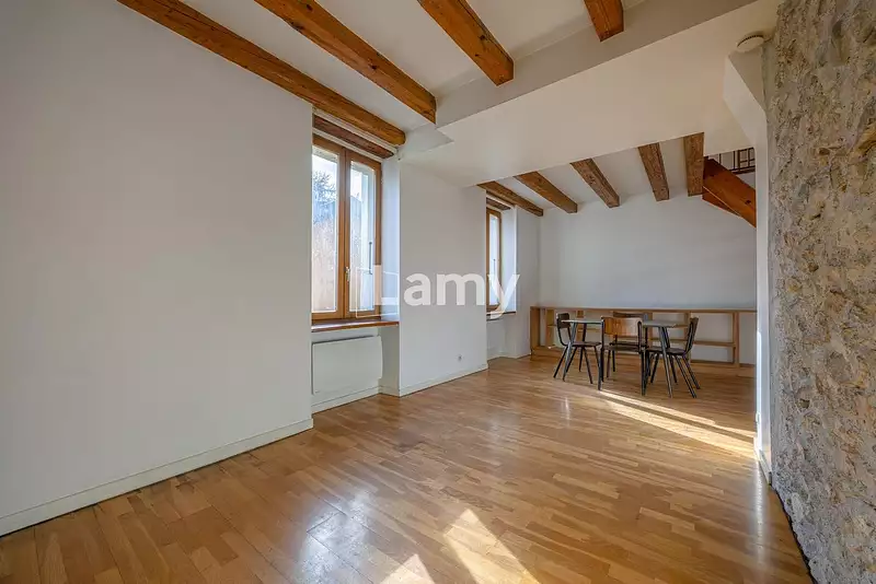 Duplex de charme sans vis-à-vis -Vieille ville D'Annecy.Au coeur de la vieille ville, découvrez ce duplex lumineux de 68 m² au sol (59 m²Loi Carrez), alliant calme et authenticité.Au premier niveau: pièce de vie traversante avec cuisine ouverte avec accès sur balcon, salle à manger et salon chaleureux avec un mur en pierres apparentes. Des WC séparés complètent ce niveau.A l'étage: deux chambres cosy dont une avec dressing, salle d'eau et un second WC.Vous profiterez d'un balcon sur cour offrant une vue dégagée sur le château et les toits de la vieille ville.En annexe, une cave privative complète le bien.La copropriété est bien entretenue, elle dispose d'un interphone, d'une terrasse commune et d'un local de rangement commun.Les +:- un des meilleurs emplacements de la vieille ville.- charme de l'ancien, poutres et pierres.- jolie vue- calme, sans-vis-à-vis- lumineux- traversant Nord/Sud.- fibre optique et interphone- faibles charges et chauffage individuel électrique- copropriété bien entretenue.La presente annonce comprend 3 lots situés dans une copropriété de 17 lots au total et ne faisant l'objet d'aucune procédure en cours citée à l'article L. 721-1 du code de la construction et de l'habitation. Montant moyen mensuel de charges déclaré par le vendeur : 31.67€ par mois (soit 380 € annuel).