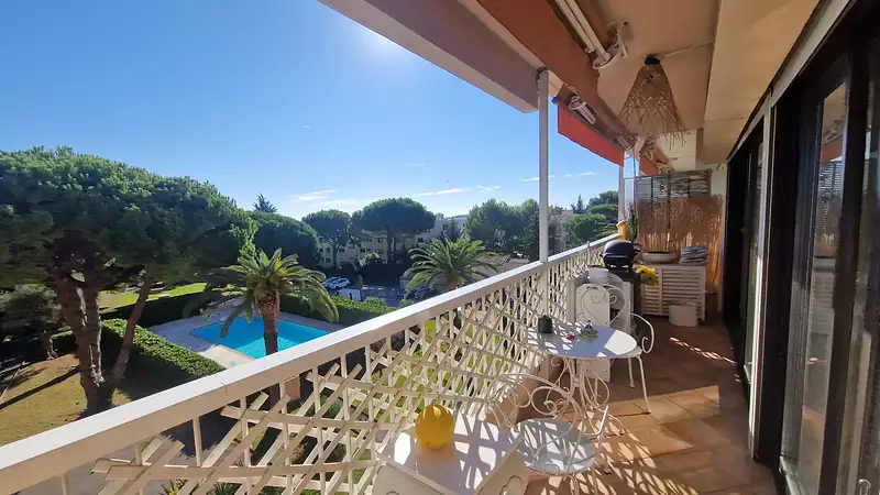 Antibes Hauteur F3 de 68 m2 traversant composé d'un séjour cuisine d'environs 30 m2 ouvrant sur une terrasse avec vue sur parc et piscine.
