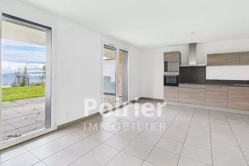 Dans une résidence récente et sécurisée, découvrez en exclusivité POIRIER IMMOBILIER ce bel appartement de 68.5 m2. Au rez-de-chaussée, il bénéficie d'une belle pièce de vie de 30 m2, avec cuisine ouverte, et accès direct au jardin privé de 333m2 et terrasse couverte. Les deux chambres, exposées ouest donnent également accès à l'extérieur. Une salle de bains avec baignoire et un WC séparé. Une vue partielle sur le lac Léman ouvre un joli dégagement, et l'appartement est lumineux grâce à ses grandes baies vitrées. Les charges de copropriété de 250€ par mois sont raisonnables et s'entendent chauffage, eau froide et chaude et entretien du jardin inclus. Un garage et une place de parking privative en sus.