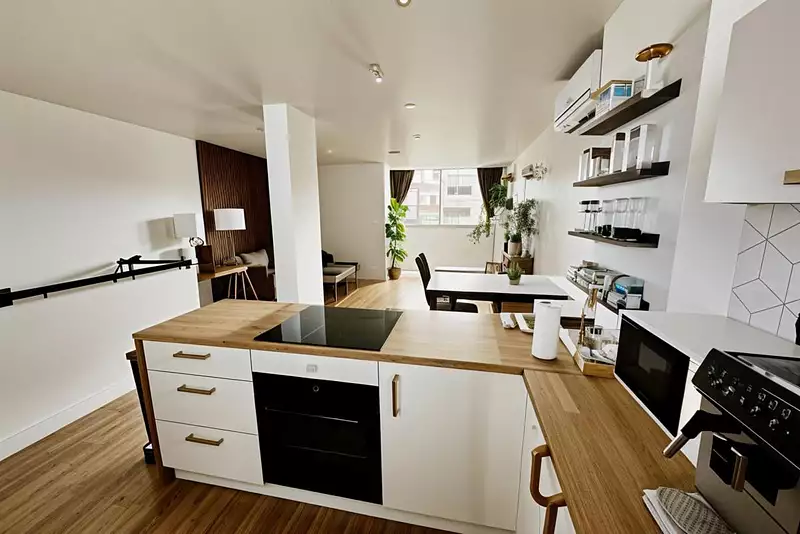 L'appartement offre une belle pièce de vie lumineuse avec cuisine ouverte, donnant sur une loggia fermée avec vue dégagée sur la verdure.