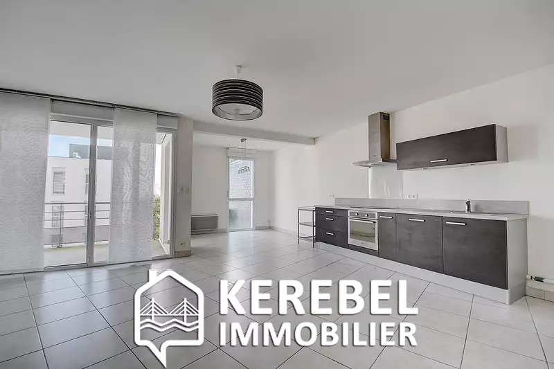 KEREBEL IMMOBILIER PLOUGASTEL : En plein centre, au 1er étage d'une résidence de 2009, bel appartement T3 d'environ 70 m². Composé d'une entrée avec placard, une cuisine aménagée semi-équipée ouverte sur le salon-séjour donnant sur une terrasse, un cellier, 2 chambres avec placards, une salle de bains. Une cave. Deux places de parking. Posez vos meubles !