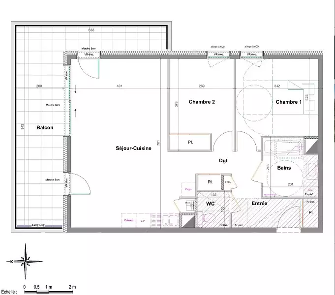 Cet appartement situé au 1er étage est composé d'une entrée avec placard, d'un séjour cuisine de 31.32 m², de deux chambres, d'une salle de bains, d'un WC séparé et d'un beau balcon de 21.58 m² orienté Sud