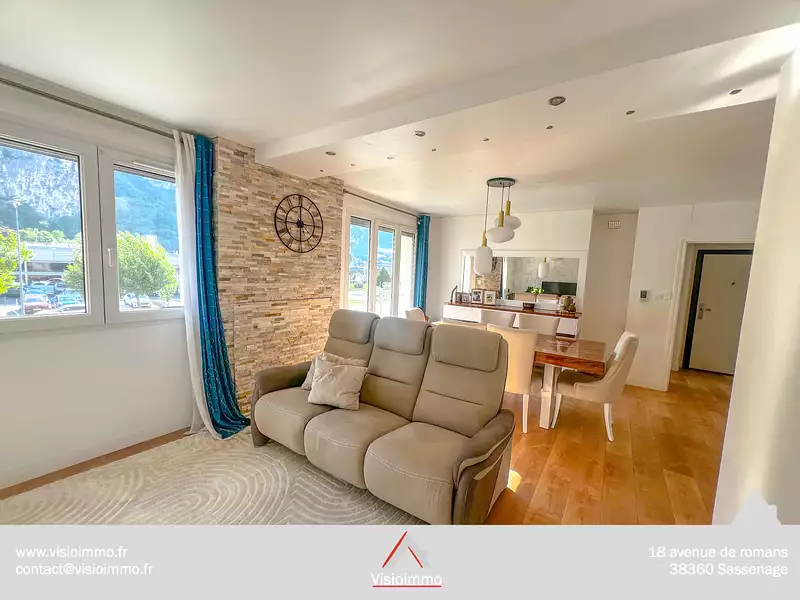 Séjour spacieux de 33m2 avec cuisine ouverte, entièrement équipée, offrant un cadre lumineux et agréable, donnant sur une loggia.