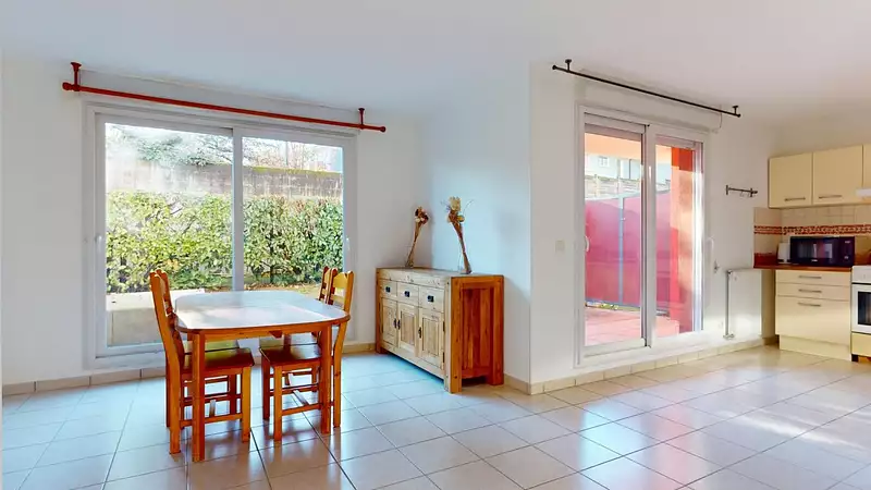 La pièce de vie avec cuisine ouverte s'ouvre sur une terrasse de 21 m², prolongée par 100 m² de jardin à usage privatif, entièrement clôturé, idéal pour profiter d'un cadre extérieur calme et sécurisé.