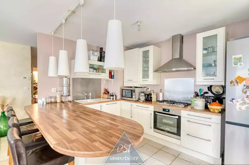 Séjour spacieux avec cuisine équipée ouverte, offrant une belle luminosité et un accès direct au jardin