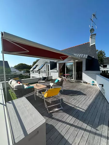 Situé à seulement 600 mètres de la grande plage, ce bel appartement en très bon état d'entretien séduira les amateurs de lieux de vie atypiques et lumineux. Au 1er et dernier étage d'une petite copropriété de seulement deux logements, il bénéficie d'un environnement calme à deux pas des activités de la station balnéaire. Vous serez surpris par sa très grande terrasse sans vis à vis, idéale pour vos repas en extérieur et vos moments de détente. Son intérieur soigné et confortable offre un séjour exposé Sud ouvert sur une cuisine de qualité toute équipée, une chambre avec placard, une pièce pour un second couchage ou un bureau, un vaste dressing aménagé, une salle d'eau et wc ainsi qu'un espace buanderie. Cerises sur le gâteau : un parking privatif dans la cour fermée et un atelier pour le rangement des vélos et affaires de plage. PRODUIT RARE A SAISIR ! (5.00 % honoraires TTC à la charge de l'acquéreur.) Copropriété de 2 lots - dont 2 lots habitation. (Pas de procédure en cours). Charges annuelles : 390 euros.