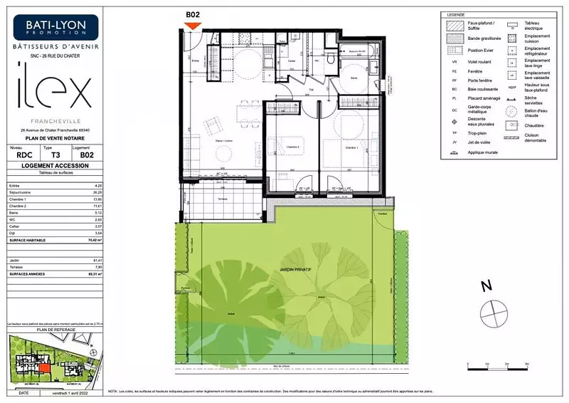 Orpi vous présente cet appartement T3 de 70,42 m² en rez-de-chaussée exposé Sud avec terrain de 89,31 m² de la résidence « ILEX » construite à Francheville. (Rhône). Cette copropriété est sécurisée (digicode ; vidéophone) et à taille humaine. Belles prestations : les logements sont dotés d'une chaudière individuelle fonctionnant au gaz, les fenêtres sont en double vitrage aluminium et les portes sont blindées 5 points. Garage double On trouve plusieurs établissements scolaires (maternelle, élémentaire, primaire et collège) à moins de 10 minutes à pied. Côté transports, il y a 5 lignes de bus ainsi que la gare Alaï à quelques pas du bien. Des autoroutes et la nationale N6 sont accessibles à moins de 10 km. On trouve des restaurants, des commerces, 4 boulangeries, un supermarché, un bureau de poste et une boucherie charcuterie à proximité du programme immobilier.
