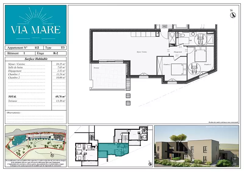 L'appartement situé au BATIMENT I, à l'étage R-2, d'une surface d'environ 69.76m2, se compose ainsi (voir plan des surfaces):