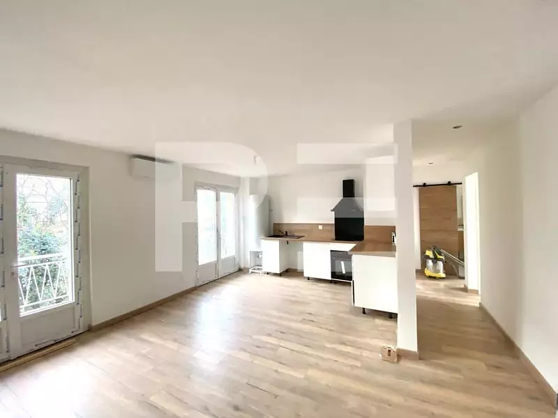 Menuiseries neuves avec double vitrage, volets roulants électriques, parquet, climatisation dans la pièce principale.