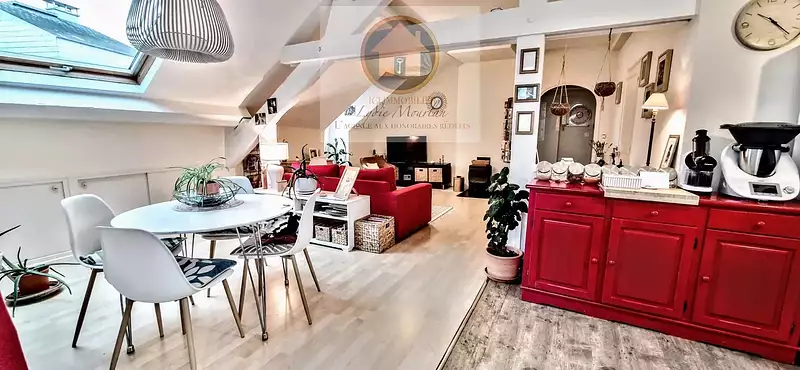 Séjour de +50 m2 (au sol), aux volumes rares et charme fou de part ses poutres apparentes et son poêle à bois.
