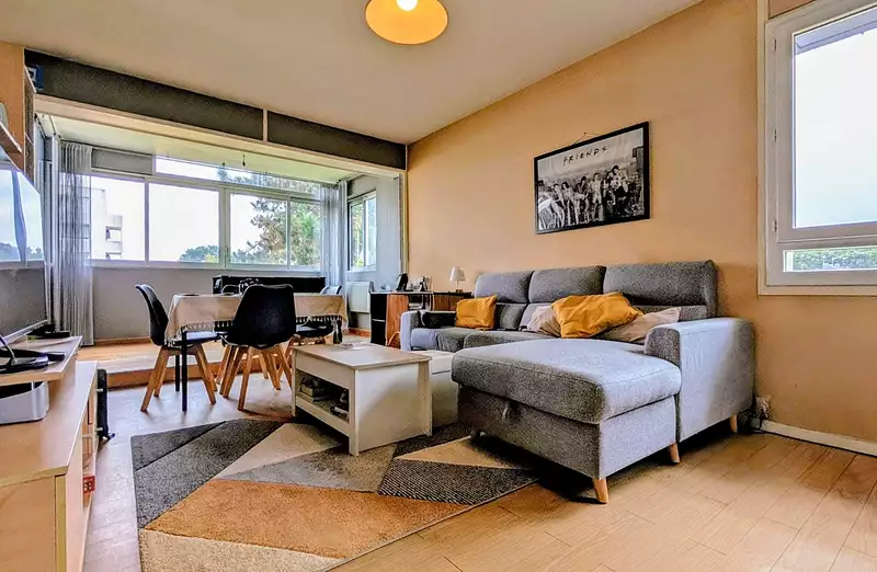 Salon/séjour avec cuisine ouverte de 34m², deux chambres, salle de bains moderne et nombreux rangements. Double vitrage et chauffage urbain. Cave et parking sécurisé inclus. À deux pas des écoles, parc et transports. Prêt à vivre.