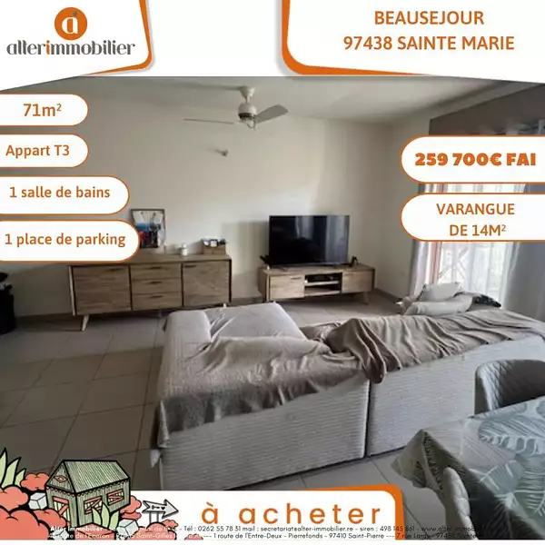 Il comprend 1 entrée, 1 séjour, 1 cuisine ouverte, 1 WC, 1 salle de bains, 2 chambres avec placard, 1 varangue d'environ 14m² et 1 place de parking.