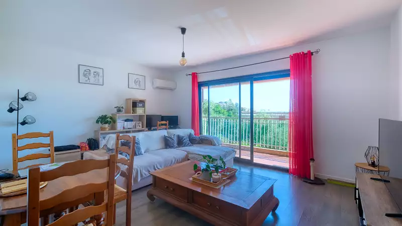 Côté mer, on retrouve un beau séjour de plus de 20 m², ainsi qu'une chambre principale de 12 m² ouvrant sur le balcon.