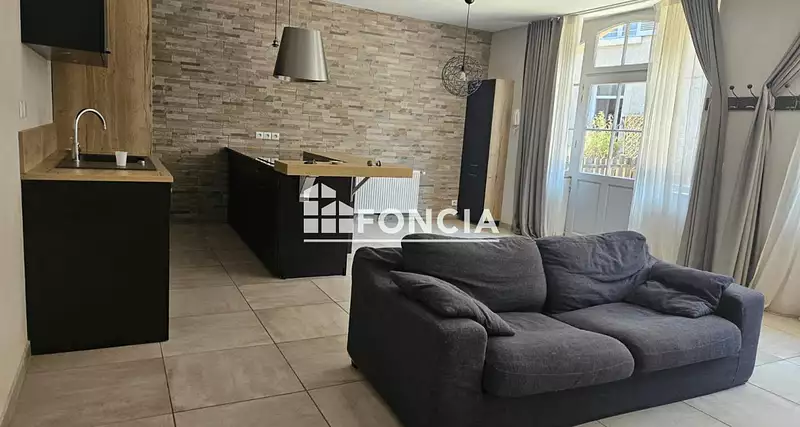 Un salon lumineux avec cuisine ouverte aménagée de 35 m2, 2 grandes portes fenêtres sur terrasse.