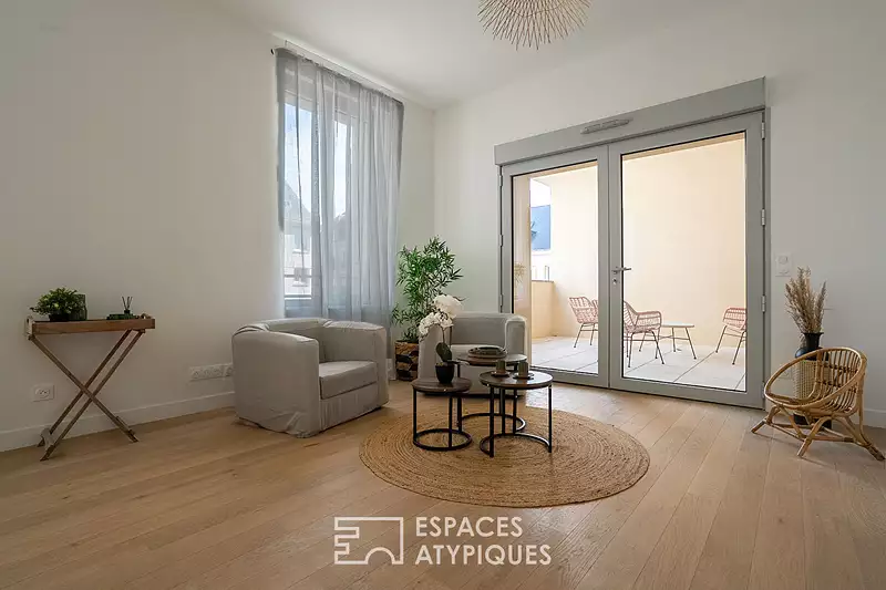 Situé dans l'une des adresses les plus prisées de Lorient, au coeur du centre-ville, cet appartement T3 d'exception prend place dans une résidence de très haut standing, née de la réhabilitation remarquable d'un bâtiment emblématique de la ville. D'une surface généreuse, il séduit immédiatement par son architecture intérieure remarquable, sa belle hauteur sous plafond et ses finitions haut de gamme. L'espace de vie, baigné de lumière naturelle grâce à de larges ouvertures, s'ouvre sur une terrasse couverte spacieuse et idéalement exposée, véritable extension extérieure de l'appartement, propice à des moments de détente et de convivialité en toute saison. L'agencement intérieur a été pensé pour offrir un cadre à la fois élégant, fonctionnel et confortable. L'entrée mène à un vaste séjour, prolongé par un espace cuisine ouvert à aménager selon vos envies. L'ensemble bénéficie d'un volume rare et d'une ambiance contemporaine raffinée. Le coin nuit se compose de deux belles chambres, pensées comme des cocons apaisants, ainsi que d'une salle d'eau moderne et d'un WC indépendant. Les matériaux sélectionnés et les finitions témoignent d'une exigence de qualité, à la hauteur de l'emplacement et de la résidence. En complément, l'appartement offre la possibilité d'annexer une grande cave en sous-sol, ainsi qu'une place de stationnement sécurisée ? des atouts rares en plein centre-ville. La résidence, entièrement sécurisée, conjugue caractère historique et prestations contemporaines, dans un esprit architectural unique. La réhabilitation soignée permet de bénéficier d'un habitat neuf et performant, tout en valorisant le patrimoine lorientais. A deux pas des commerces, écoles, transports, restaurants et espaces culturels, cet appartement allie une qualité de vie citadine remarquable avec un accès rapide aux plages et au littoral breton. Une opportunité rare dans un cadre de vie unique, pour les amateurs d'architecture, de lumière et de beaux volumes. CLASSE ÉNERGIE : C / CLASSE CLIMAT : A Montant estimé des dépenses annuelles d'énergie pour un usage standard : entre 660 euros et 930 euros/an (sur la base des prix moyens des années 2021 à 2023) ? Les informations sur les risques auxquels ce bien est exposé sont disponibles sur le site www.georisques.gouv.fr Simon JOUANNO 06 31 35 17 70 RSAC Lorient 929 999 316 Copropriété de 72 lots. Charges annuelles : 1700 euros. Simon JOUANNO (EI) Agent Commercial - Numéro RSAC : 929999316 - LORIENT.