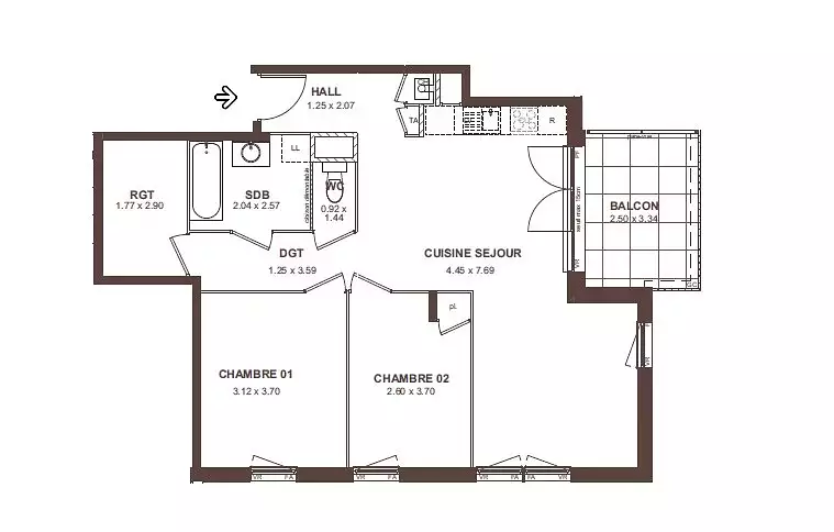| 71,11 m² - 3 pièces - 2 chambres | Étage 1/2 avec ascenseur |