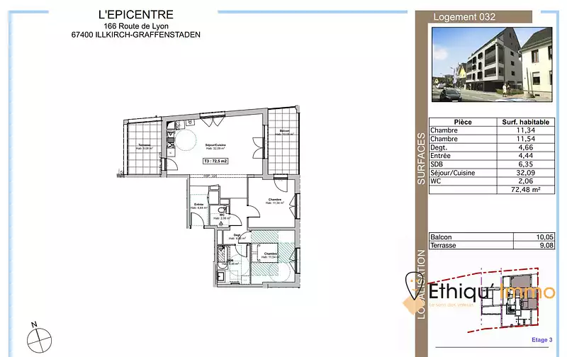 Lot 32 — F3 de 72,48 m² avec double orientation, balcon + terrasse, séjour traversant