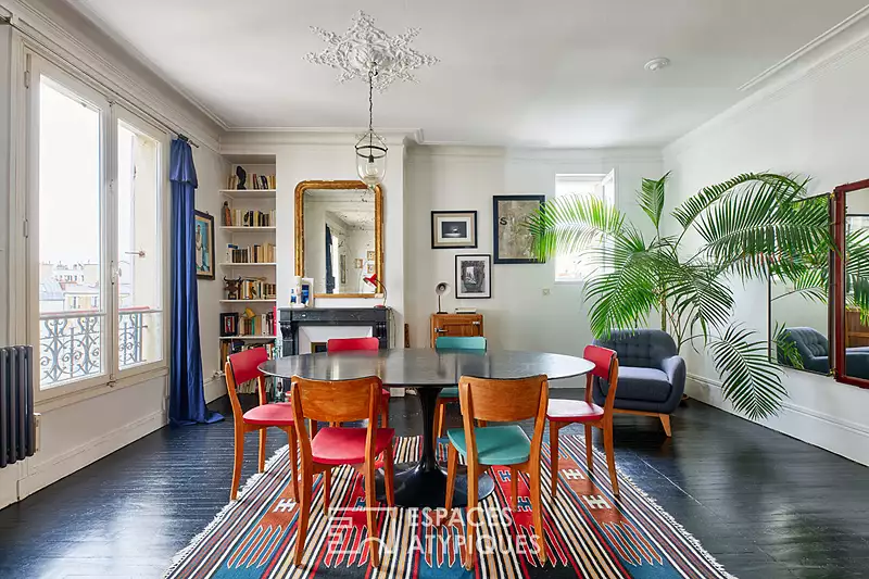 Situé dans le 18e arrondissement, à la lisière des 9e et 10e, cet appartement de 72,17 m² Carrez déploie ses volumes en enfilade, entièrement tournés sur cour, au calme absolu du 5e étage d'un immeuble ancien du début XXe siècle, sécurisé et doté d'un gardien. L'entrée dessert une cuisine séparée et équipée, suivie d'une salle d'eau avec toilettes et d'une chambre spacieuse de plus de 14 m². Dans le prolongement, la vaste pièce de vie de plus de 33 m² séduit par ses volumes généreux, sa luminosité constante et ses détails d'époque : moulures, parquet ancien, et deux cheminées se faisant face - l'une en marbre, l'autre de style prussien - qui confèrent à l'ensemble une atmosphère unique et chaleureuse. La circulation fluide et la générosité des volumes permettent d'envisager aisément la création d'une seconde chambre, selon les besoins. Ce bien rare conjugue authenticité, calme et centralité, à deux pas du métro Barbès?Rochechouart, des commerces, des transports et des marchés des quartiers limitrophes. Une grande cave de 6,83 m2 et un local à vélos complètent ce bien soumis au régime de copropriété. Métros Barbès - Rochechouart (Ligne 2 et 4) Contact : Prune +33 6 72 07 40 95 Copropriété de 59 lots - dont 26 lots habitation. (Pas de procédure en cours). Charges annuelles : 2100 euros. PRUNE SARTOR (EI) Agent Commercial - Numéro RSAC : 532 522 539 - Paris.