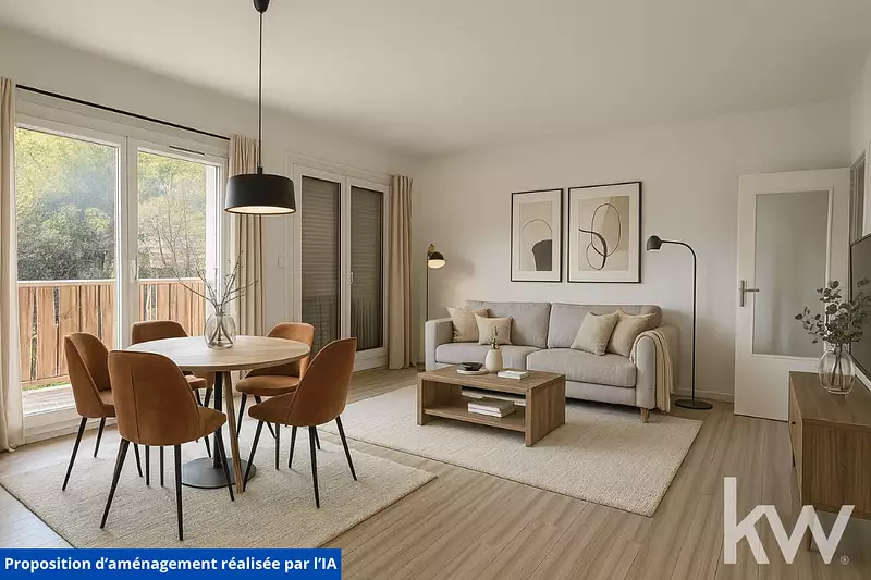 Il propose un séjour lumineux ouvert sur un balcon, deux chambres, une cuisine indépendante, une salle d’eau et des WC séparés.