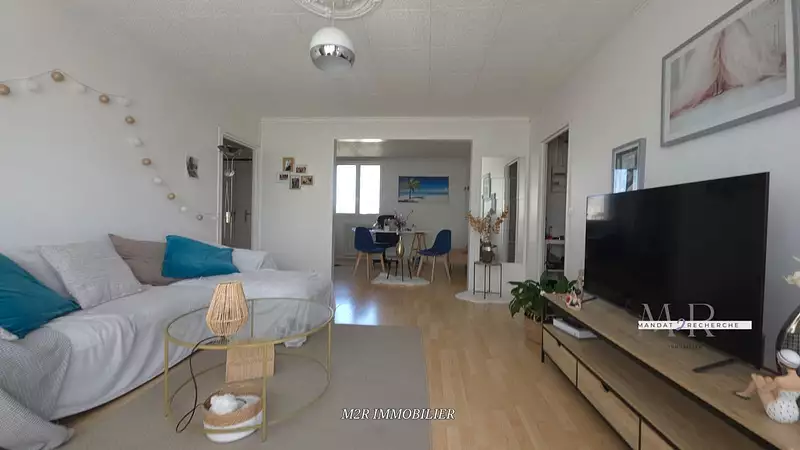 72 m² traversants : séjour de 25 m² + loggia sud ; cuisine attenante ouvrable pour créer 38 m² de pièce de vie.