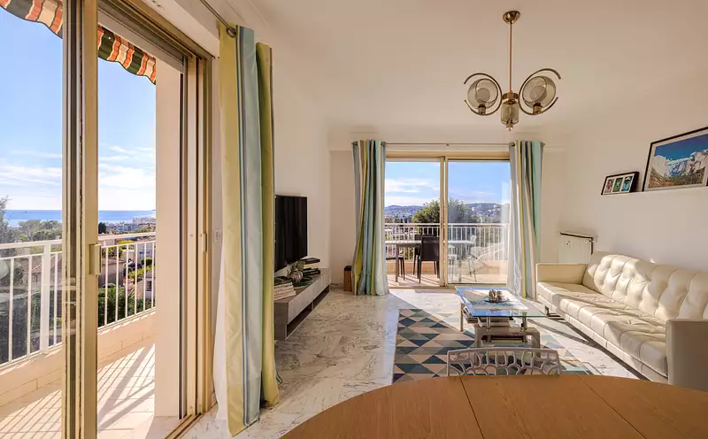 Une vaste terrasse en angle de 15m2 offre un espace extérieur avec une vue dégagée sur la mer, les collines, la vieille ville et le Château de Cagnes.