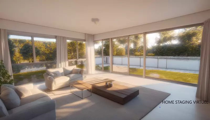 * un séjour salon baigné de lumière grâce à ses baies vitrées ouvertes sur le parc paysagé