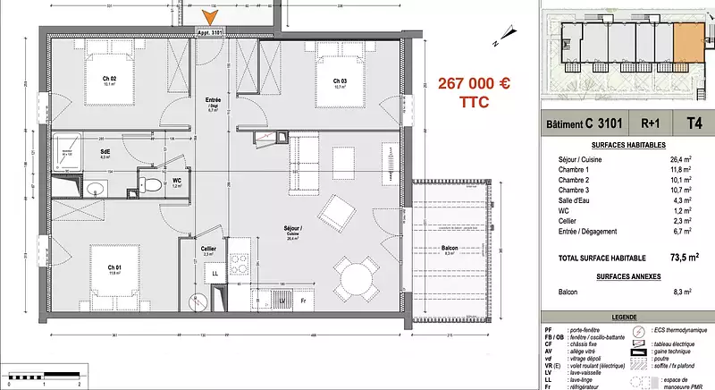 | 73 m² - 4 pièces - 3 chambres | Orientation : Est, Ouest, Sud, Sud-Ouest |
