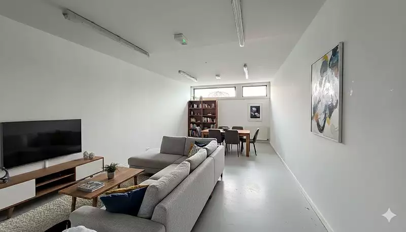Le rez-de-chaussée se compose d'une vaste pièce de réception de 37m², de deux pièces de 10 et 11m², d'un local technique, de toilettes séparées. L'escalier du 1er étage dessert une pièce sous combles de près de 9m² habitables.