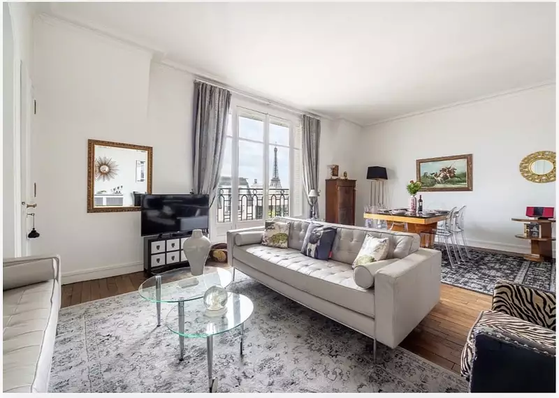 Situé au 6e étage d'un élégant immeuble ancien, un appartement de 75 m2 très lumineux et aux vues dégagées de part et d'autre de l'appartement. Le salon offre une vue sur la Tour Eiffel et la chambre sur les réservoirs de Passy.