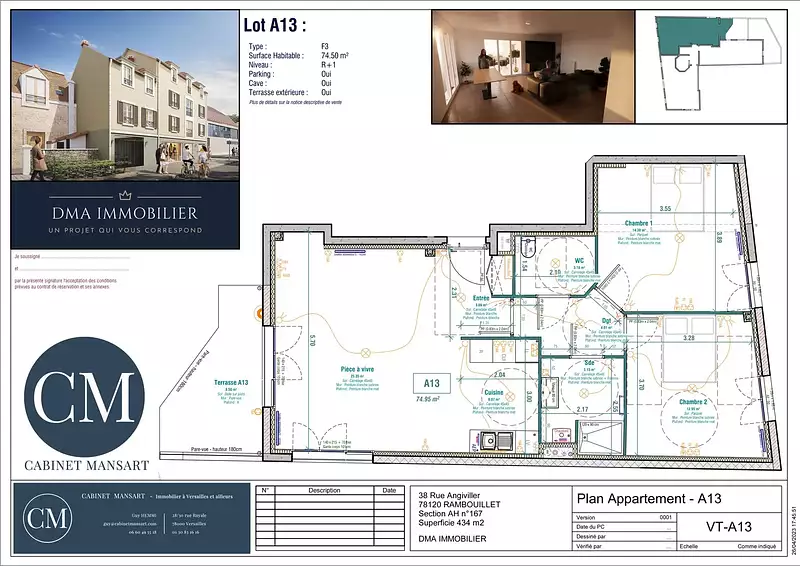 Superficie totale de 74,95m² Carrez, situé au 1er étage avec ascenseur :