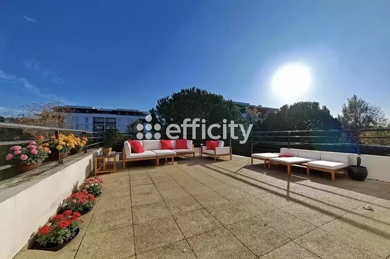 L'appartement se compose d'une entrée avec rangements, d'un double salon donnant sur un grand rooftop de presque 50 m² avec vue dégagée, d'une cuisine semi-équipée, de deux chambres avec placard (dont une bénéficie d'un balcon), d'une salle de bains et de toilettes séparés.