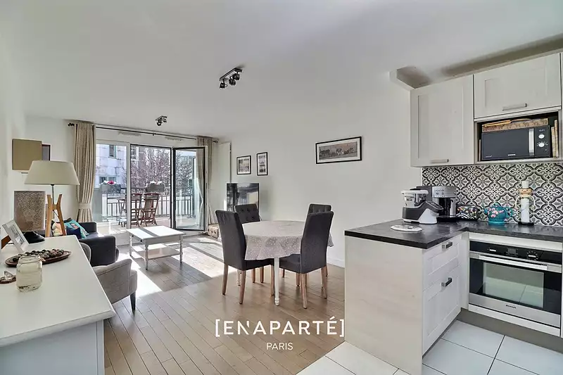 LEVALLOIS - Collange - Parc des 5 Continents. Situé au 2ème étage avec ascenseur d'un immeuble récent de standing, [EN'APARTÉ] vous propose un appartement traversant profitant de deux balcons d'une surface totale de 10 m². En parfait état, cet appartement est composé d'une entrée avec un espace bureau avec des placards sur mesure, d'un séjour/salle à manger donnant sur un grand balcon exposé plein Sud au calme sur jardin et sans vis à vis, d'une cuisine ouverte entièrement aménagée et équipée. La partie nuit se compose de deux grandes chambres avec placards dont une ayant accès à un balcon, d'une belle salle de bain et d'un toilette indépendant. Nous observons que son caractère traversant avec sa double exposition Sud-Est / Nord-Ouest, ses nombreuses et grandes fenêtres lui confèrent une excellente luminosité tout au long de la journée. Un emplacement de parking et une cave agrémentent ce bien rare.