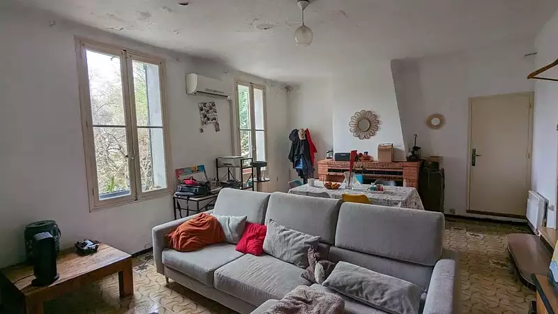 Très facile d'accès, dans une maison de village en copropriété (3 lots d'habitations - pas de charges - pas de procédure en cours) dont la toiture et les façades sont en bon état général, appartement traversant et lumineux de 75m² loi Carrez, situé au 2ème étage, rénové en partie et composé de: cuisine, séjour avec cheminée et climatisation, 2 chambres, salle d'eau/WC et espace dressing. Equipé du double vitrage en partie, volets bois, toiture PST + tuiles. La cuisine, la SdE/WC et une chambre ont été rénovées récemment. Au 3ème et dernier étage: grenier 47m² en indivision. En RDC: grand garage de 59m². Traversant d'Est en Ouest, vues village et parc.