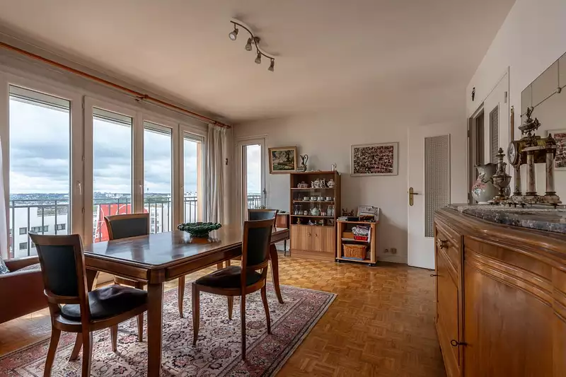 En dernier étage avec ascenseur, un appartement traversant de 4 pièces de 75 m² qui se compose : entrée, double séjour ( possible 3ème chambre) avec balcon, une cuisine séparée aménagée, couloir avec placards, 2 chambres avec balcon, salle d'eau et w.c. séparé.